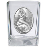 This 1.5 ounce square shot glass is highlighted with a fine pewter casting. Made in USA.