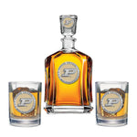 This 24-ounce glass decanter is embellished with a fine pewter casting. It comes with two Double Old Fashioned glasses. A great addition to any home bar! Made in USA.