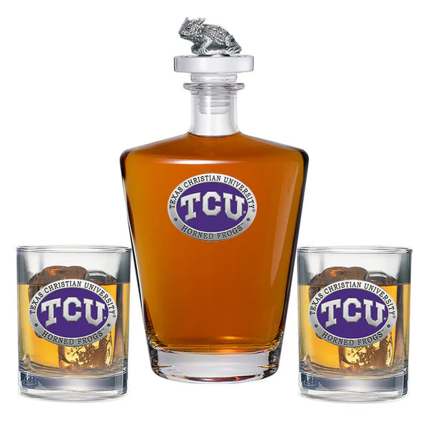 This 25 ounce glass decanter is embellished with a fine pewter casting and a 3-dimensional figure on top. Be sure to match it with some of our Double Old Fashioned glasses. A great addition to any home bar! Made in USA.