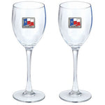 This is a set of two 12 ounce glass goblets with a fine pewter logo medallion bonded to the side. It could be used to serve water, wine or other beverages. Made in USA.