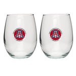This is a set of two 12 ounce glass goblets with a fine pewter logo medallion bonded to the side. It could be used to serve water, wine or other beverages. Made in USA.