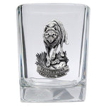 This 1.5 ounce square shot glass is highlighted with a fine pewter casting. Made in USA.