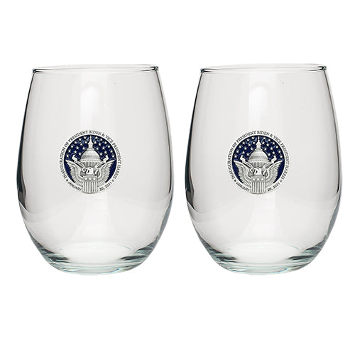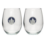 This is a set of two 12 ounce glass goblets with a fine pewter logo medallion bonded to the side. It could be used to serve water, wine or other beverages. Made in USA.