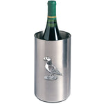 This is a wine chiller made of double-wall insulated stainless steel with a fine pewter logo medallion bonded to the front.
