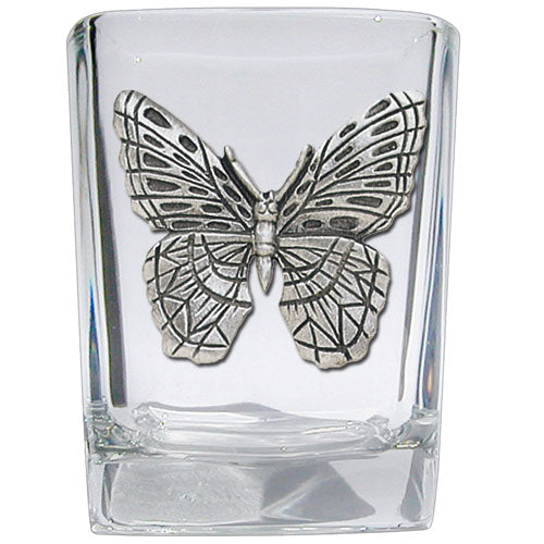 This 1.5 ounce square shot glass is highlighted with a fine pewter casting. Made in USA.