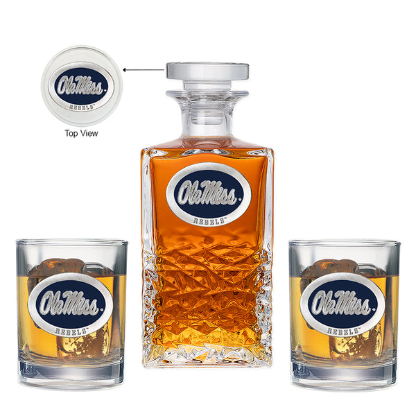 This 25-ounce glass decanter is embellished with a fine pewter casting matched with two Double Old Fashioned Glasses. A great addition to any home bar! Made in USA.