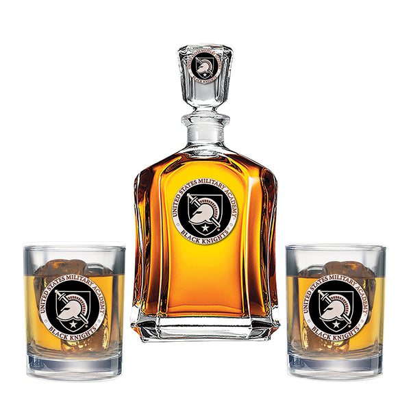 This 24-ounce glass decanter is embellished with a fine pewter casting. It comes with two Double Old Fashioned glasses. A great addition to any home bar! Made in USA.