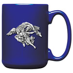This coffee mug is decorated with a fine pewter casting. It is microwaveable and dishwasher safe with no heat cycle.. The glass coffee mug is 16 ounces, and the ceramic coffee mug is 15 ounces.