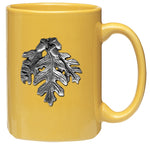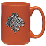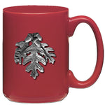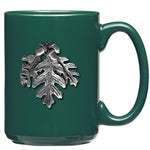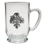 This coffee mug is decorated with a fine pewter casting. It is microwaveable and dishwasher safe with no heat cycle.. The glass coffee mug is 16 ounces, and the ceramic coffee mug is 15 ounces.