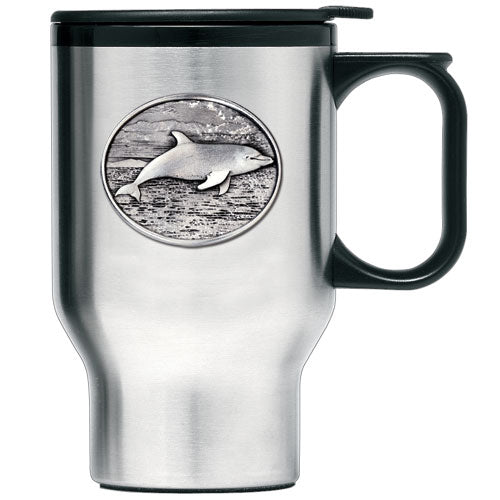 This double wall stainless steel travel mug is insulated and it is stainless inside and out. It is embellished with a fine pewter decorative casting. The lid has a non-spill...