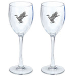 This is a set of two 12 ounce glass goblets with a fine pewter logo medallion bonded to the side. It could be used to serve water, wine or other beverages. Made in USA.