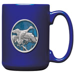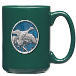 This coffee mug is decorated with a fine pewter casting. It is microwaveable and dishwasher safe with no heat cycle.. The glass coffee mug is 16 ounces, and the ceramic coffee mug is 15 ounces.
