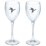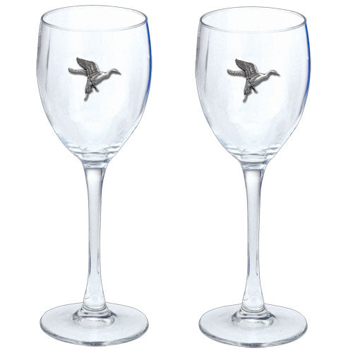 This is a set of two 12 ounce glass goblets with a fine pewter logo medallion bonded to the side. It could be used to serve water, wine or other beverages. Made in USA.