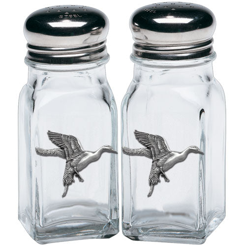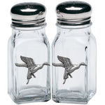 This is a set of salt & pepper shakers with a fine pewter logo medallion bonded to the side. Made in USA.