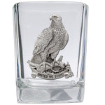 This 1.5 ounce square shot glass is highlighted with a fine pewter casting. Made in USA.