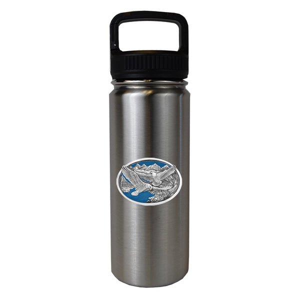 This 27 oz (800 mil) double wall stainless steel thermos is insulated and it is stainless inside and out. It is embellished with a fine pewter decorative casting. The lid has a screw on lid with a handle for easy transport.Heritage Pewter has been hand-crafting fine pewter gifts since 1988. We offer an array of pewter products, ranging from barware to wind chimes, golf clubs to coffee mugs.