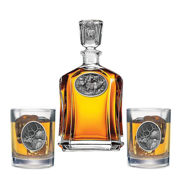 This 24-ounce glass decanter is embellished with a fine pewter casting. It comes with two Double Old Fashioned glasses. A great addition to any home bar! Made in USA.