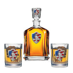 This 24-ounce glass decanter is embellished with a fine pewter casting. It comes with two Double Old Fashioned glasses. A great addition to any home bar! Made in USA.