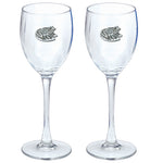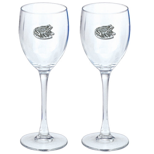 This is a set of two 12 ounce glass goblets with a fine pewter logo medallion bonded to the side. It could be used to serve water, wine or other beverages. Made in USA.