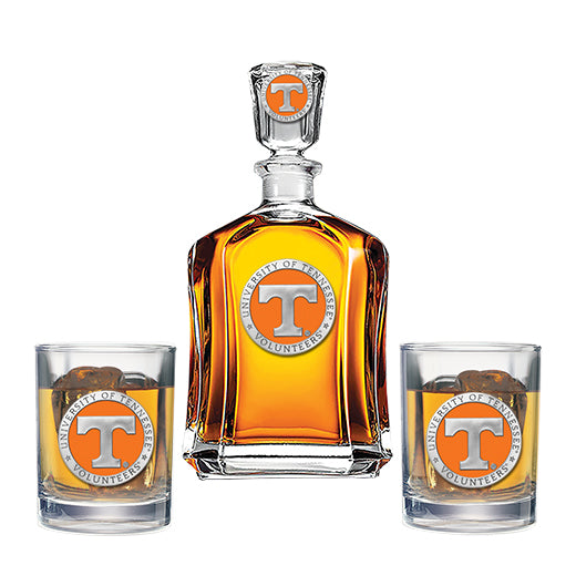 This 24-ounce glass decanter is embellished with a fine pewter casting. It comes with two Double Old Fashioned glasses. A great addition to any home bar! Made in USA.