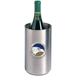 This is a wine chiller made of double-wall insulated stainless steel with a fine pewter logo medallion bonded to the front.