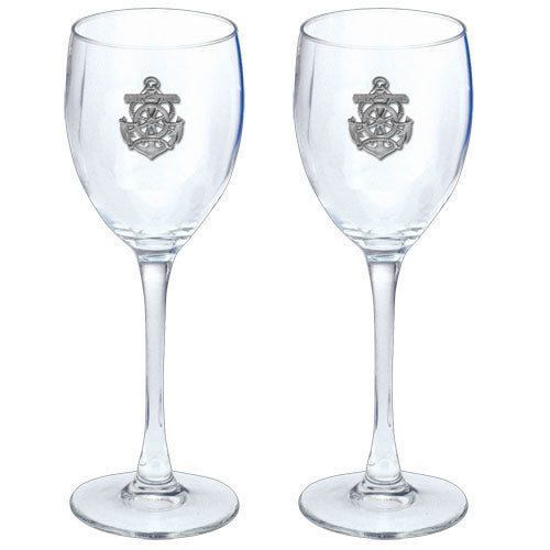 This is a set of two 12 ounce glass goblets with a fine pewter logo medallion bonded to the side. It could be used to serve water, wine or other beverages. Made in USA.