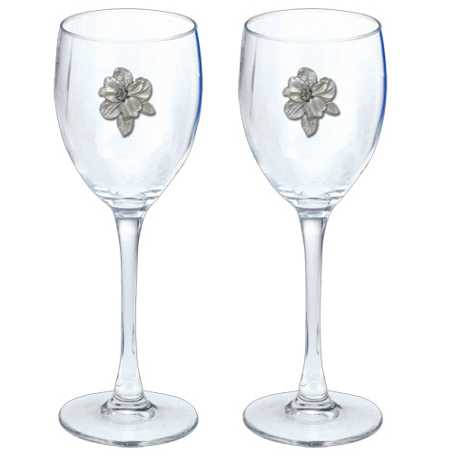 This is a set of two 12 ounce glass goblets with a fine pewter logo medallion bonded to the side. It could be used to serve water, wine or other beverages. Made in USA.