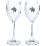 This is a set of two 12 ounce glass goblets with a fine pewter logo medallion bonded to the side. It could be used to serve water, wine or other beverages. Made in USA.