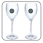 This is a set of two 12 ounce glass goblets with a fine pewter logo medallion bonded to the side. It could be used to serve water, wine or other beverages. Made in USA.