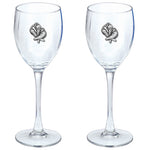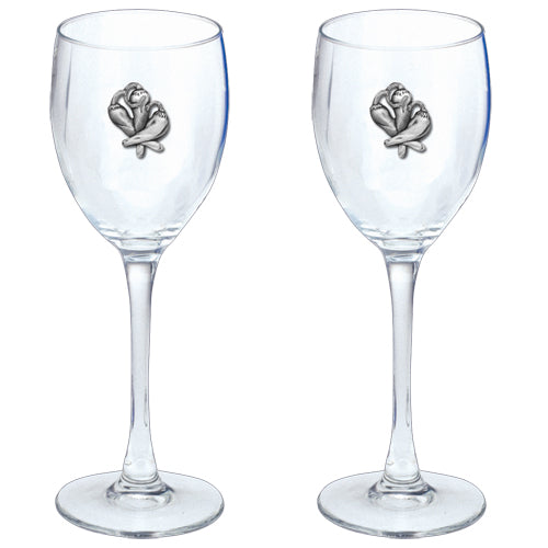 This is a set of two 12 ounce glass goblets with a fine pewter logo medallion bonded to the side. It could be used to serve water, wine or other beverages. Made in USA.