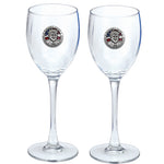 This is a set of two 12 ounce glass goblets with a fine pewter logo medallion bonded to the side. It could be used to serve water, wine or other beverages. Made in USA.
