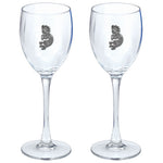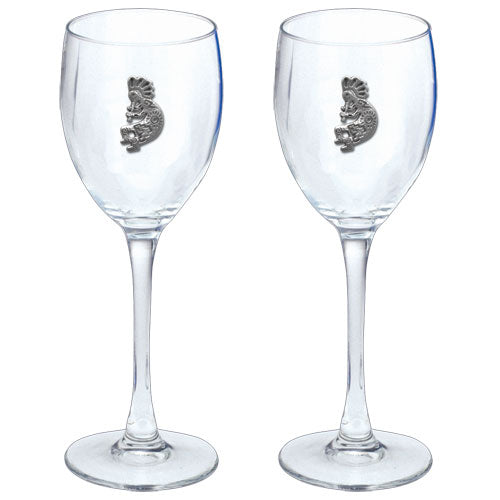 This is a set of two 12 ounce glass goblets with a fine pewter logo medallion bonded to the side. It could be used to serve water, wine or other beverages. Made in USA.
