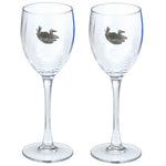 This is a set of two 12 ounce glass goblets with a fine pewter logo medallion bonded to the side. It could be used to serve water, wine or other beverages. Made in USA.