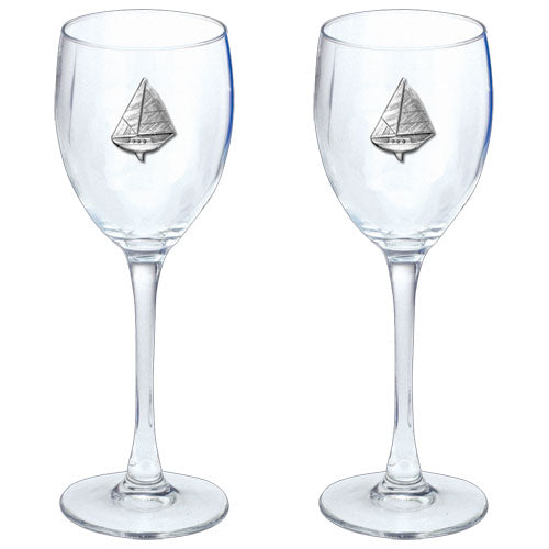 This is a set of two 12 ounce glass goblets with a fine pewter logo medallion bonded to the side. It could be used to serve water, wine or other beverages. Made in USA.