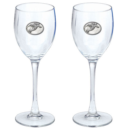 This is a set of two 12 ounce glass goblets with a fine pewter logo medallion bonded to the side. It could be used to serve water, wine or other beverages. Made in USA.