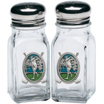 This is a set of salt & pepper shakers with a fine pewter logo medallion bonded to the side. Made in USA.