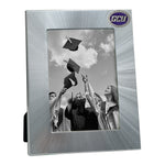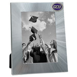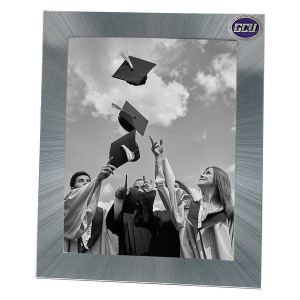 This photo frame is fabricated with brushed aluminum and accented with a fine pewter casting. Protective glass and easelback included. Assembled in USA.