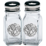 This is a set of salt & pepper shakers with a fine pewter logo medallion bonded to the side. Made in USA.