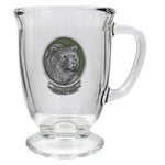 This coffee mug is decorated with a fine pewter casting. It is microwaveable and dishwasher safe with no heat cycle.. The glass coffee mug is 16 ounces, and the ceramic coffee mug is 15 ounces. Yellowstone National Park banner prominently displayed.