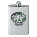 This 8 ounce stainless steel flask is embellished with a fine pewter casting. Assembled in USA. Yellowstone National Park banner prominently displayed.