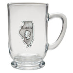 This coffee mug is decorated with a fine pewter casting. It is microwaveable and dishwasher safe with no heat cycle.. The glass coffee mug is 16 ounces, and the ceramic coffee mug is 15 ounces.