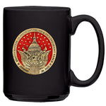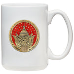 This coffee mug is decorated with a fine pewter casting and 24K Gold Plating. It is microwaveable and dishwasher safe with no heat cycle. This USA American Brand ceramic coffee mug is 15 ounces.