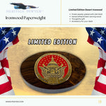 This handcrafted Limited Edition Desert Ironwood Paperweight, made from the finest pewter and plated with 24K Gold, makes a thoughtful gift for graduations, retirements, congratulations on a new job or promotion. It is also the perfect accessory for your desk or work area. Ironwood is appreciated for its beauty, rarity and durability. The best carving wood is dead Ironwood that has been baked in the desert sun, dehydrated by nature, at a temperature exceeding 140 degrees F. for over 100 years. The Desert Ironwoods rich finish complements your space and the 24K Gold Trump/Vance Inauguration medallion displays your support of our President.