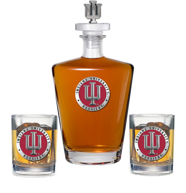 This is a set of a 25-ounce glass decanter with a fine pewter casting, 3D Topper, and two Double Old Fashioned Glasses. A great addition to any home bar! Made in USA.