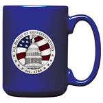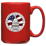 This coffee mug is decorated with a fine pewter casting. It is microwaveable and dishwasher safe with no heat cycle.. The glass coffee mug is 16 ounces, and the ceramic coffee mug is 15 ounces.