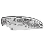 This knife is constructed of stainless steel with fine pewter accent details. It is equipped with a belt clip on the back side and also included is a nylon pouch. This is all contained in the clear-top gift box. Assembled in USA.