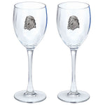This is a set of two 12 ounce glass goblets with a fine pewter logo medallion bonded to the side. It could be used to serve water, wine or other beverages. Made in USA.