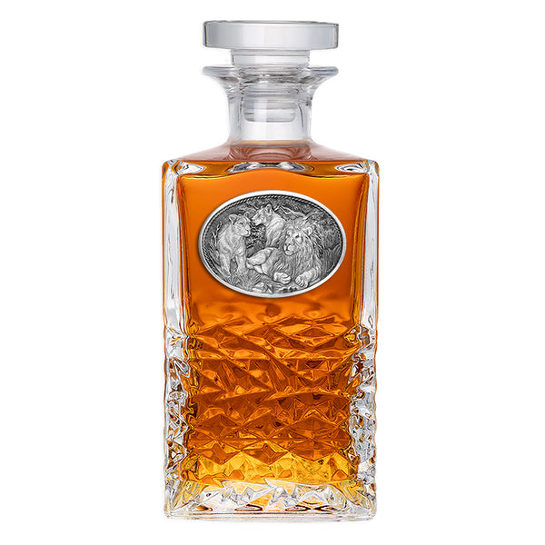 This 25 ounce glass decanter is embellished with a fine pewter casting. Be sure to match it with some of our Double Old Fashioned glasses. A great addition to any home bar!