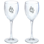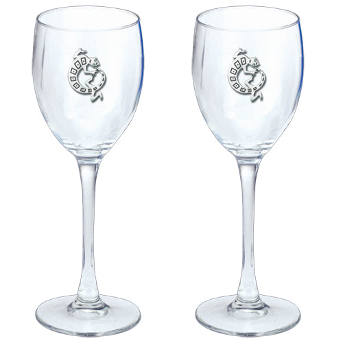 This is a set of two 12 ounce glass goblets with a fine pewter logo medallion bonded to the side. It could be used to serve water, wine or other beverages. Made in USA.