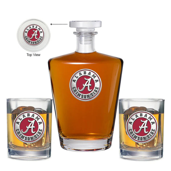 This 25 ounce glass decanter is embellished with a fine pewter casting. Added 14 ounce two double old fashioned glass is the ultimate vessel for your favorite beverage. It is exquisitely detailed with a fine pewter casting. Made in USA.